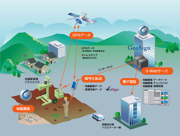 私たちはITを導入した新しい地盤調査システムである「G-Web system」の提供を通じて、信頼できる調査結果に電子認証という「証」(あかし)をつけて、皆さまにお届けいたします。